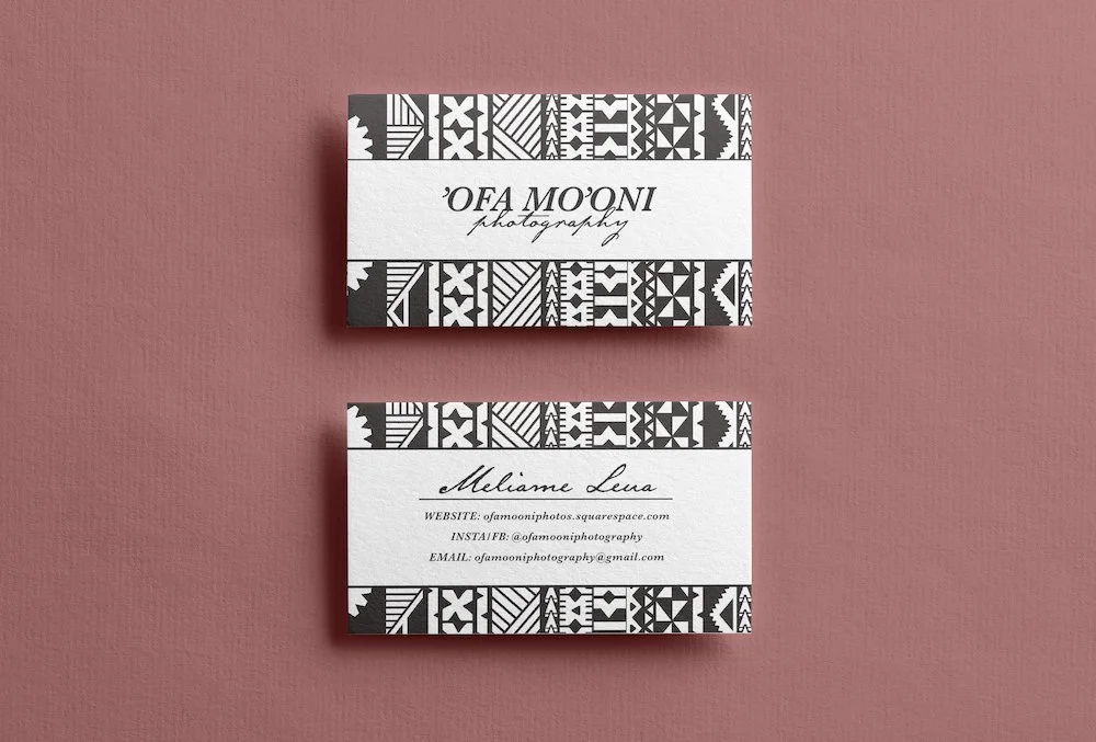 ‘Ofa Mo’oni is a local photography business that specializes in family and couple photography. It was important to Meliame that her business cards reflect her polynesian heritage, so we worked together to incorporate hand-drawn traditional patterns that are an iconic visual of her culture.